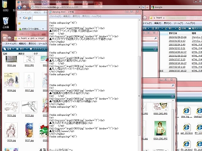 タグを<tr>で3個繋げたらなんとかなるのかなーと、色々やったけど結局左のコンテンツテーブルを入れたらイラスト3枚はきついな・・・とか思って、そのままに。